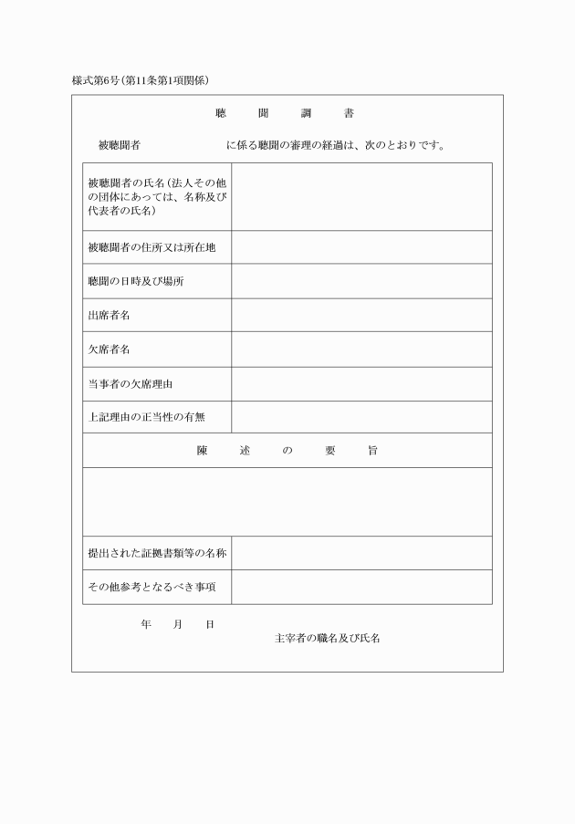 第5条 法第17条第1項又は条例第17条第1項の規定により主宰者が関係人に対し、聴聞に関する手続に参加することを求めるときは、当該聴聞の期日の1週間前までに通知しなければならない。