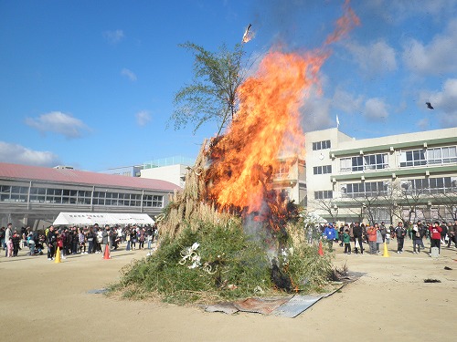 一年の無病息災を祈る地域の行事です。ポンポンと竹がはじける音とともに崩れました。(2012年1月8日撮影)