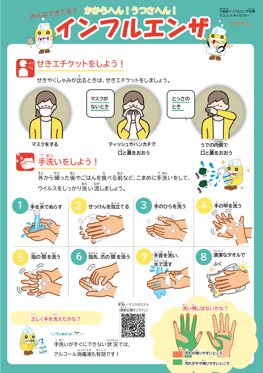 手洗い・マスクの着用・せきエチケット、など、予防対策にご留意いただくようお願いします。
