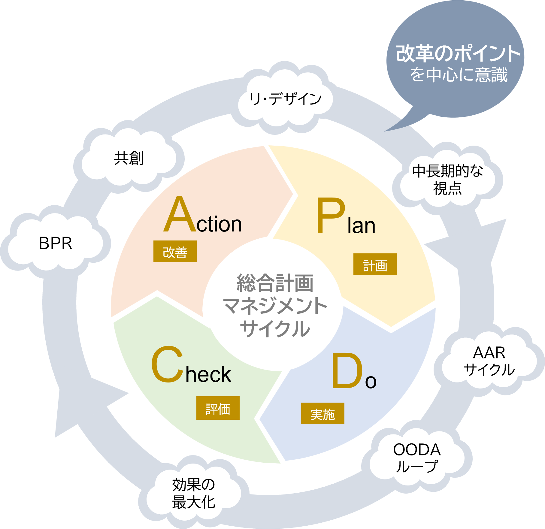 そこで、総合計画マネジメントサイクルのすべての段階において、計画的かつ継続的な行財政改革の推進を図ります。