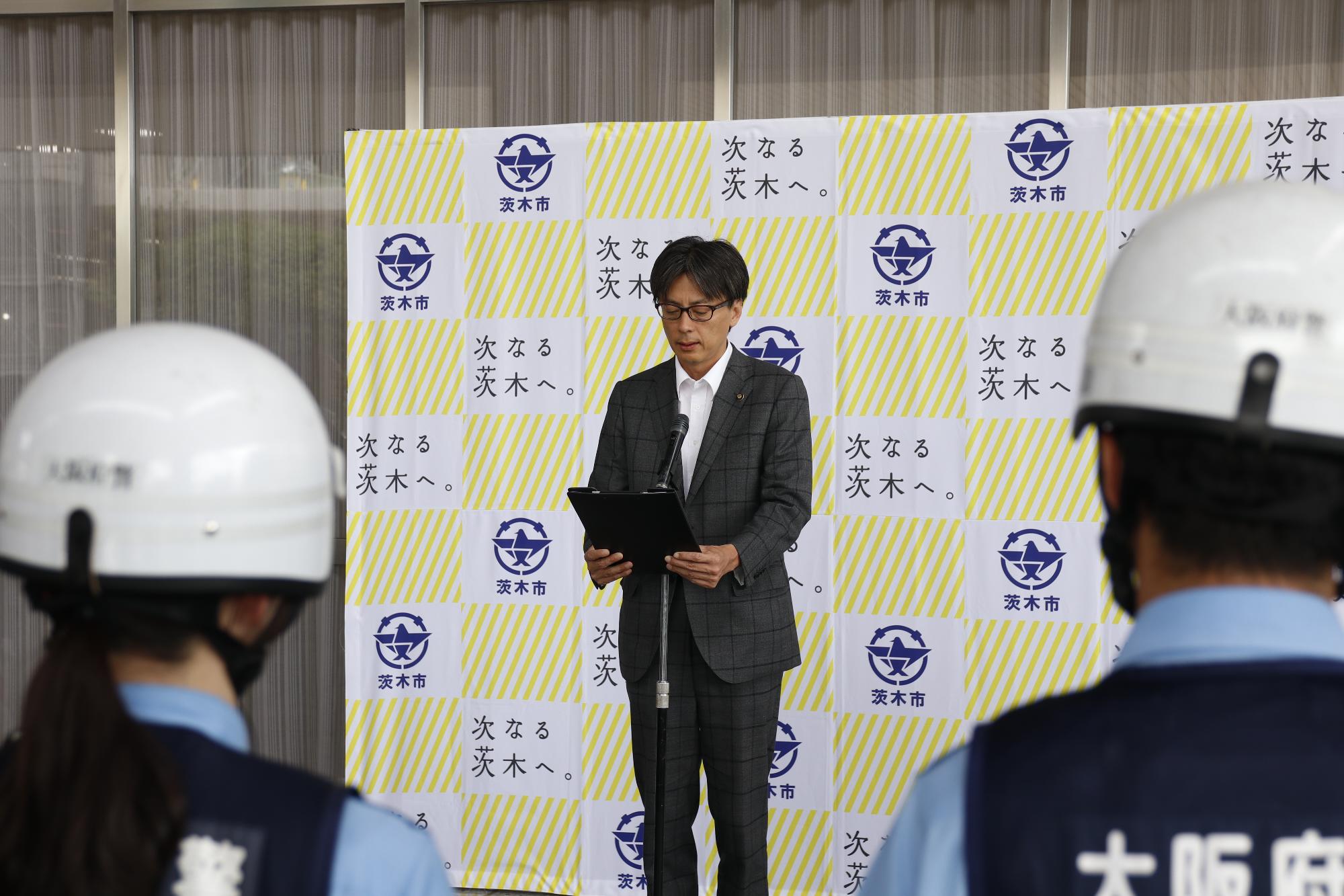 茨木市特殊詐欺多発警報発令「特別警戒隊」出発式
