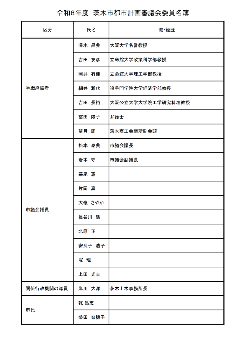 茨木市都市計画審議会条例第8条に基づき、都市計画審議会は常務委員会を設置しています。